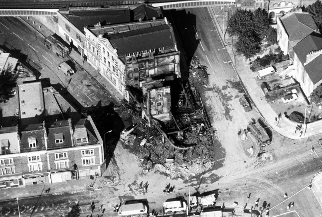 Aerial view of fire engines outside a burnt-out furniture warehouse on Coldharbour Lane. The shops on the left have their windows boarded up (Picture by SSPL/Getty Images)
